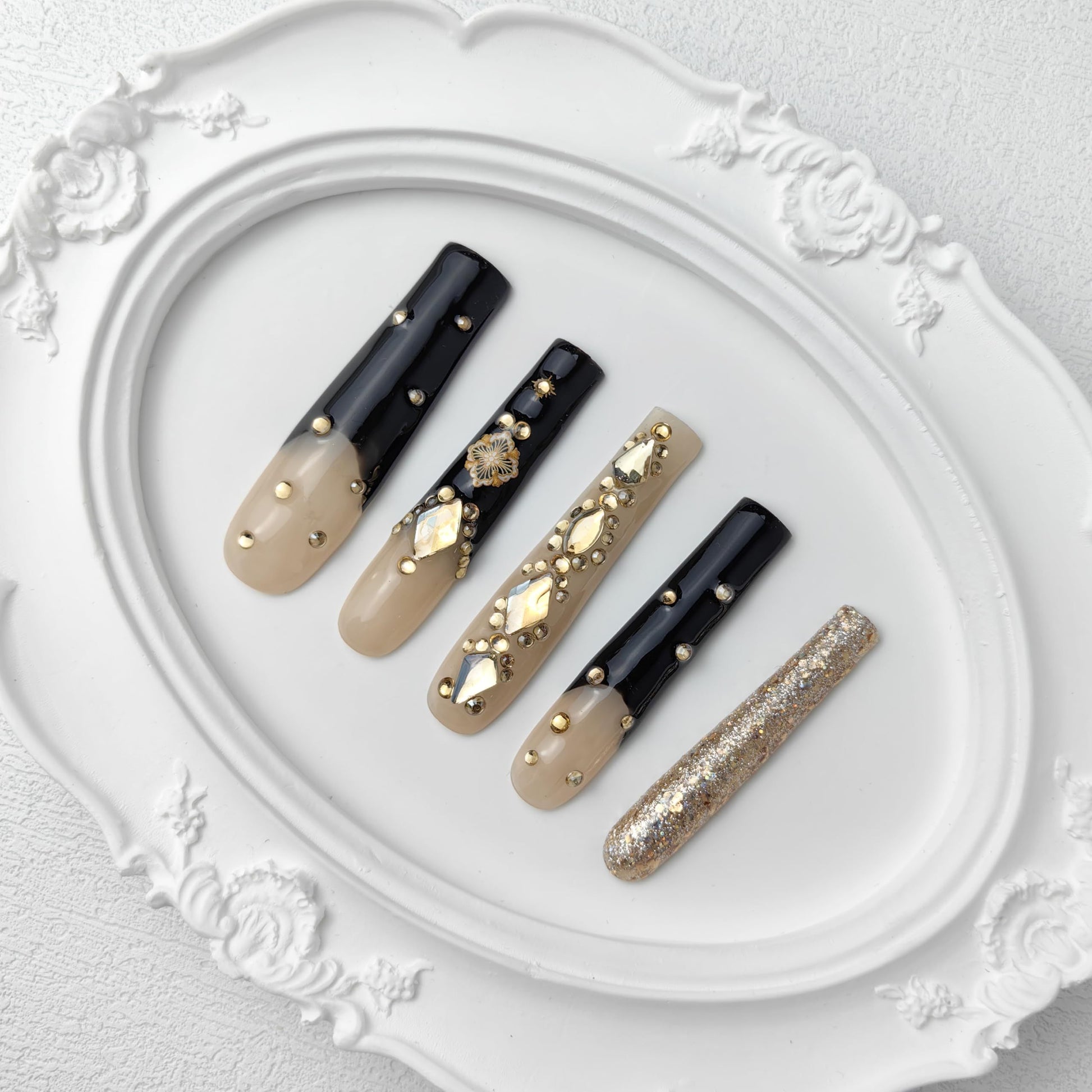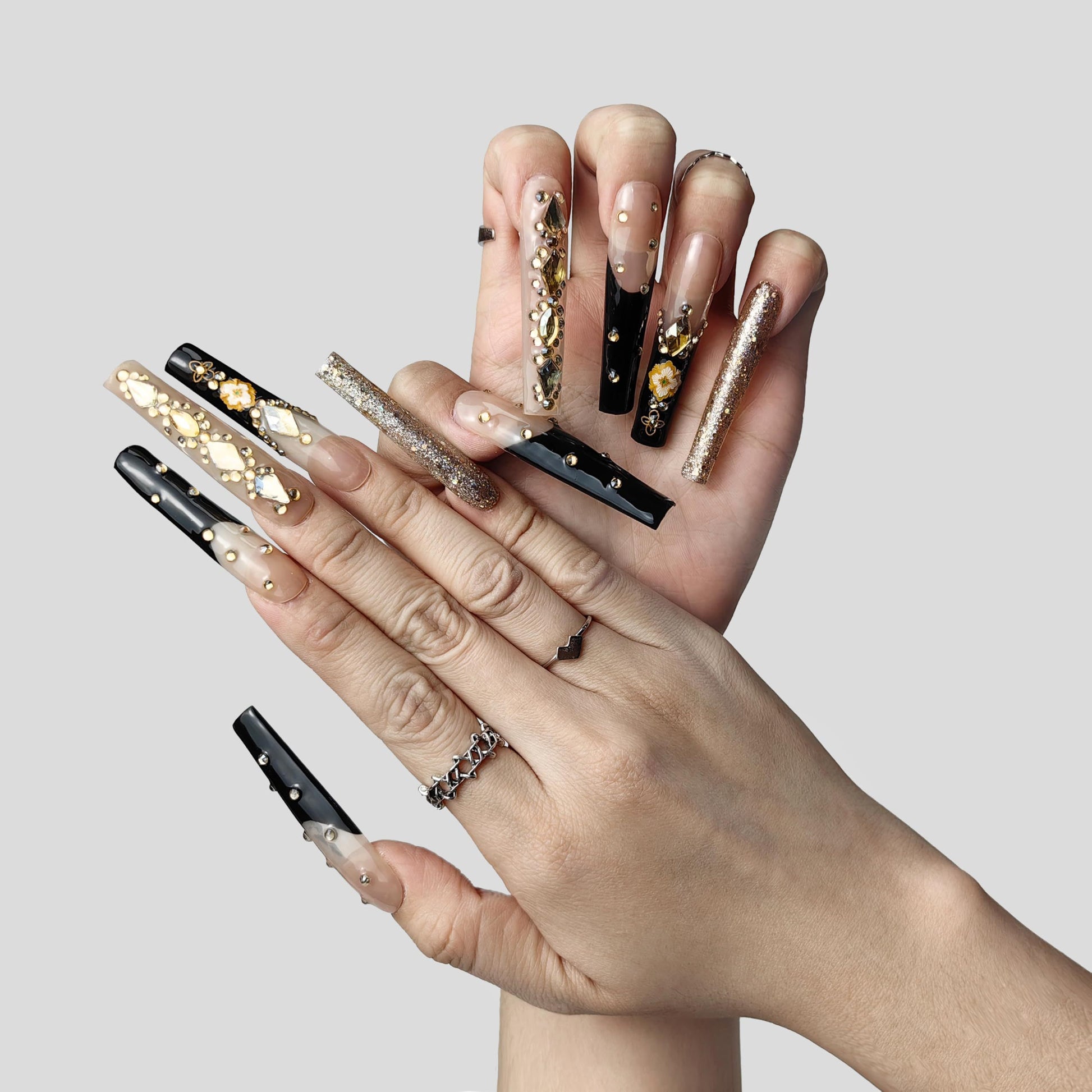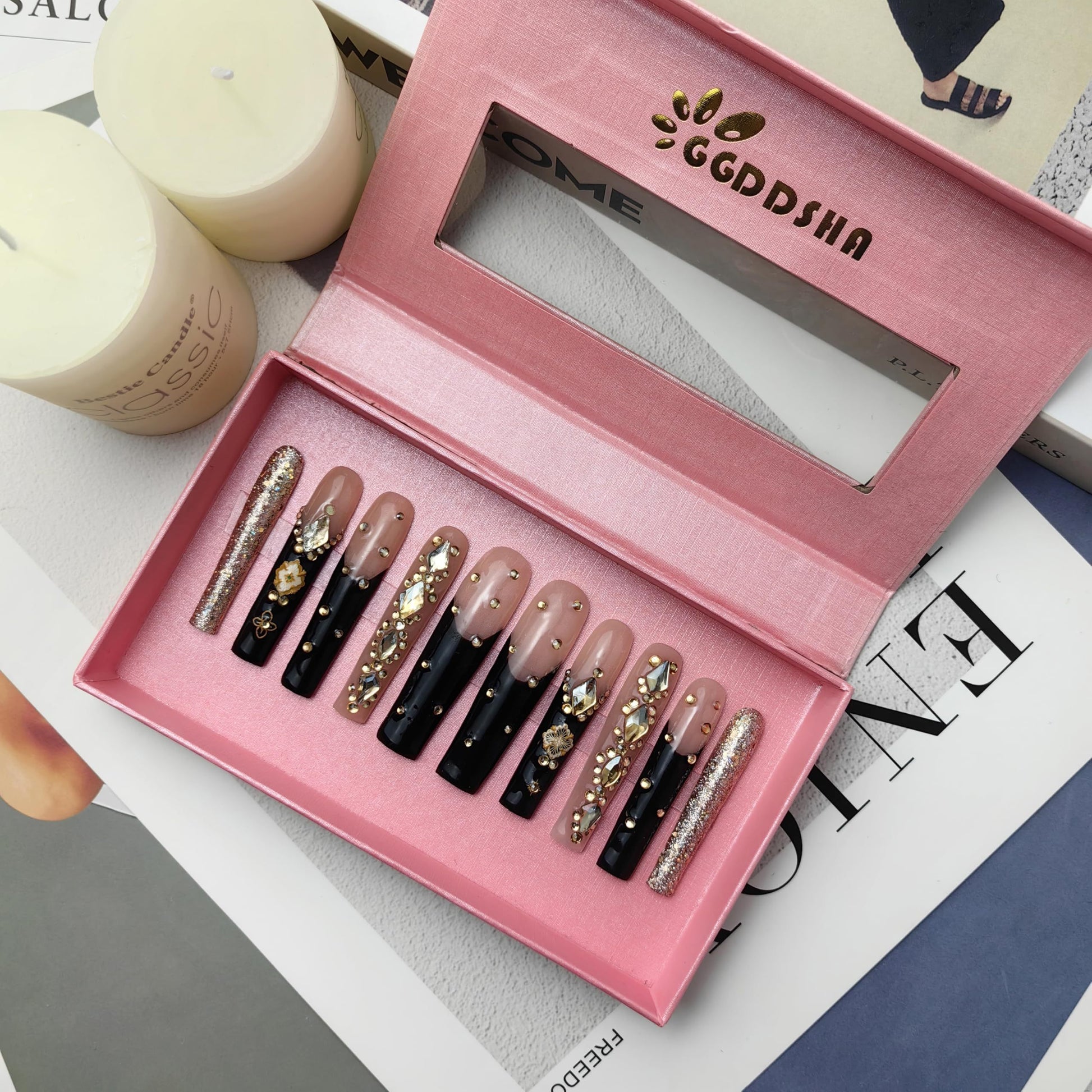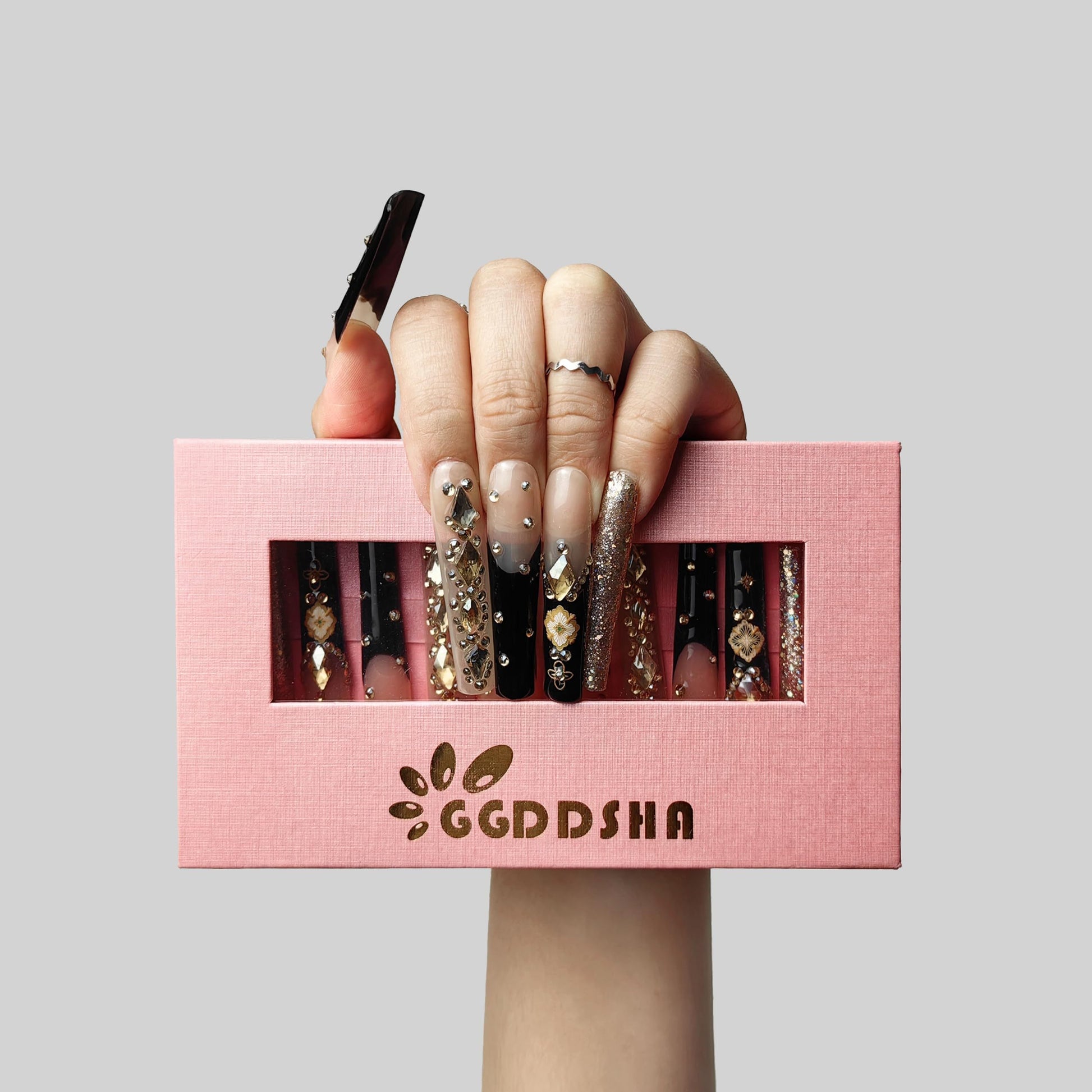 GGDDSHA Nails Handmade Press On Nails Long PinkDesign By Nail Technician, Handmade Painted Nail ArtReusable Stick On Nails In S,M,L 3Sizes,Eclipse Elegance